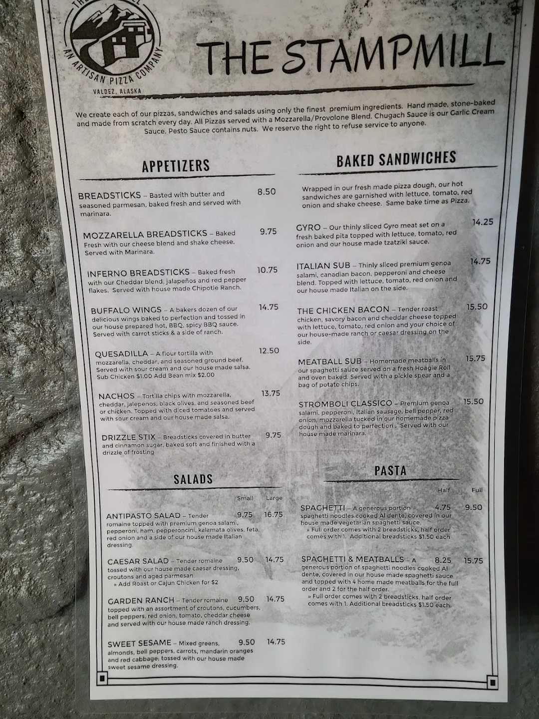The Stampmill is a restaurant located in Valdez, United States. The average rating of this business is 4.40 out of 5 stars based on 110 reviews. The street address of this business is 328 Egan Ave, Valdez, AK 99686, United States. The Stampmill is closed on Monday and Tuesday, and other days it is open from 11:30am to 10:00pm.