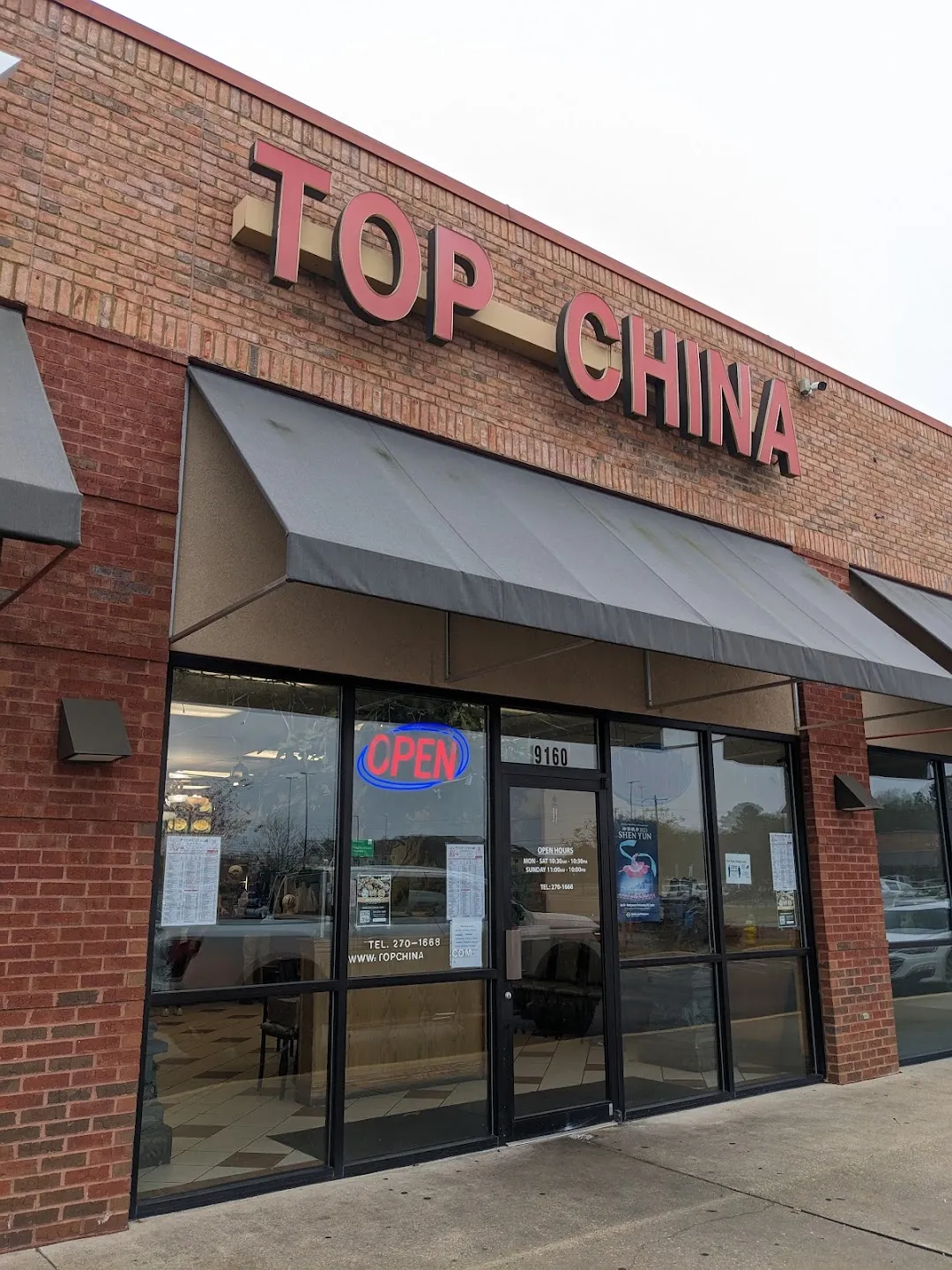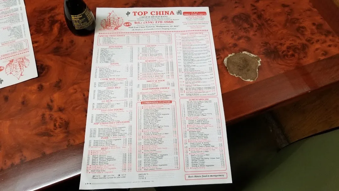 Top China is a chinese restaurant and asian restaurant located in Montgomery, United States. The average rating of this business is 4.30 out of 5 stars based on 653 reviews. The street address of this business is 9160 Eastchase Pkwy, Montgomery, AL 36117, United States. Top China is closed on Tuesday, and other days it is open from 10:30am to 10:00pm.