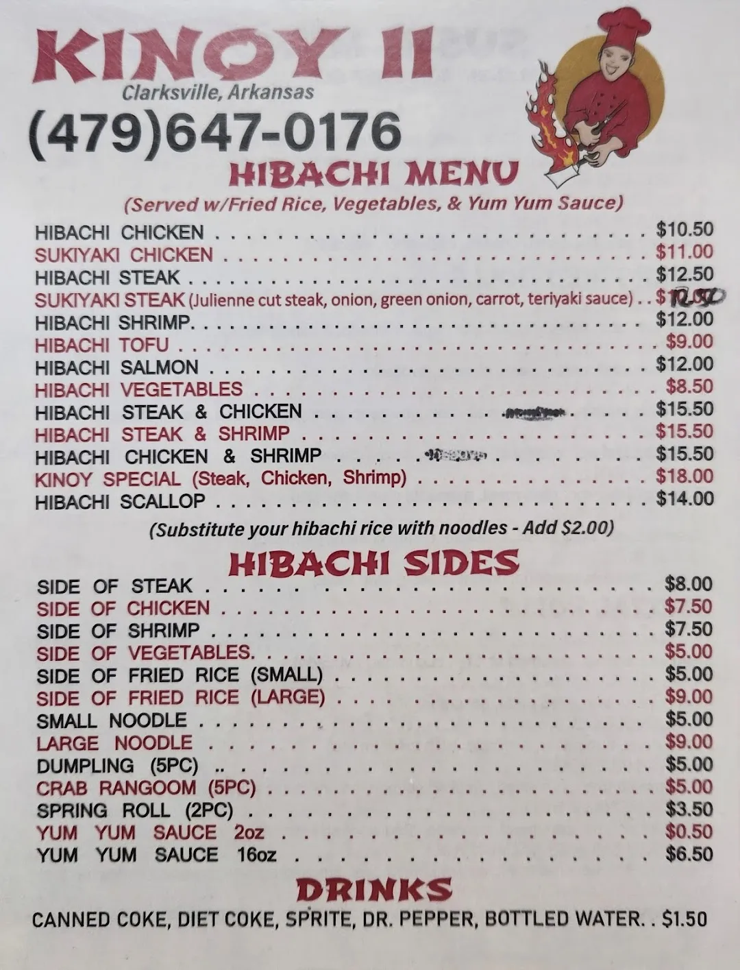 Kinoy II Hibachi Restaurant is a restaurant located in Clarksville, United States. The average rating of this business is 4.50 out of 5 stars based on 130 reviews. The street address of this business is 1620 W Main St, Clarksville, AR 72830, United States. Kinoy II Hibachi Restaurant is closed on Sunday, and other days it is open from 11:00am to 01:00pm.